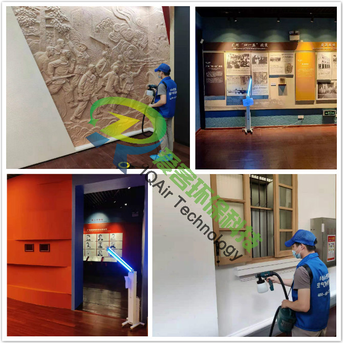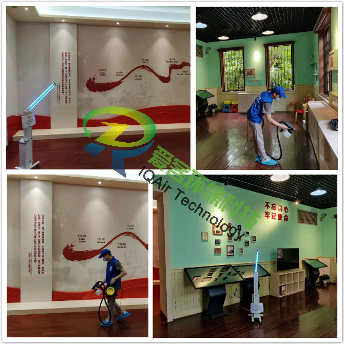 愛客工程師們對紀念館一、二樓展區(qū)地板、墻面、翻新門窗表面逐一噴灑愛客濃縮型異味分解酶(食品級)與強力TVOC清除劑(食品級),以消除化學異味分子,降解甲醛及TVOC。并結合紫外線燈進行殺菌消毒治理。