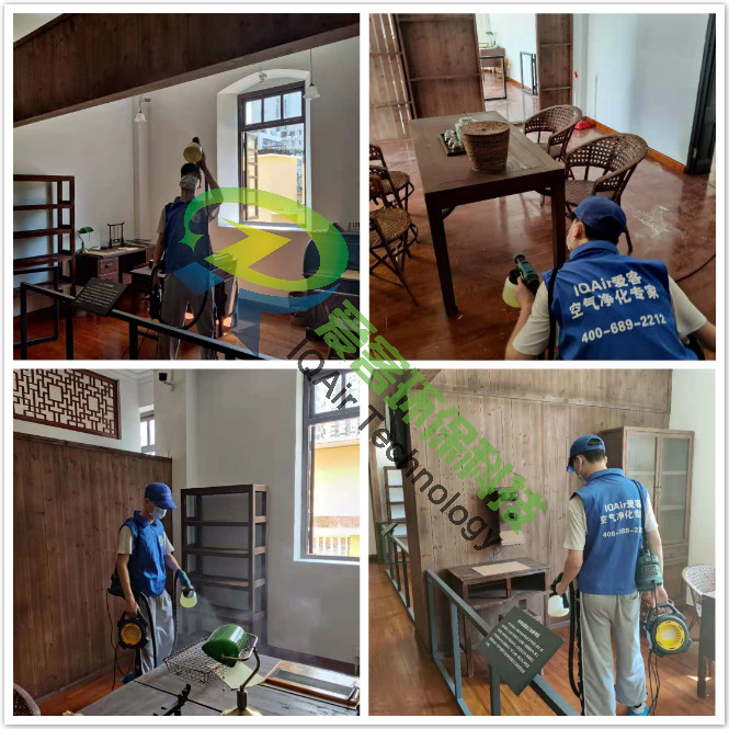 愛(ài)客工程師們對(duì)紀(jì)念館一、二樓展區(qū)地板、墻面、翻新門(mén)窗表面逐一噴灑愛(ài)客濃縮型異味分解酶(食品級(jí))與強(qiáng)力TVOC清除劑(食品級(jí)),以消除化學(xué)異味分子,降解甲醛及TVOC。并結(jié)合紫外線燈進(jìn)行殺菌消毒治理。